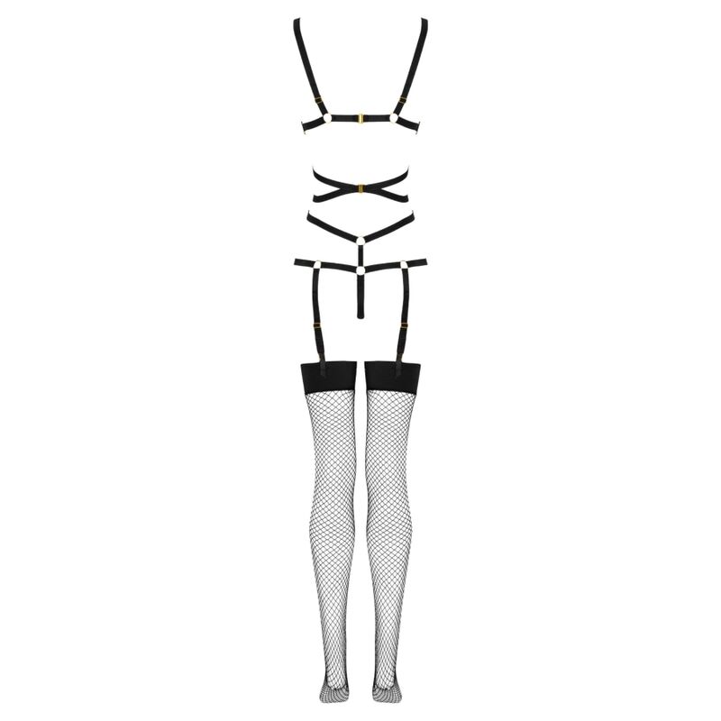 Das Oberteil des Sets besteht aus sexy schwarzen Streifen, die auf dem Bauch ineinander verschlungen und mit Ringen verbunden sind. Die Träger oben umschließen die Brust elegant, ohne sie zu bedecken, während sie sich unten sanft in einen Tanga verwandeln. Einzelne Träger verlaufen an beiden Seiten des Tangas und schmiegen sich charmant an die Hüften. Der untere Teil des Sets besteht aus schwarzen Strümpfen mit verstellbarer Länge aus Netzstoff. Die Strümpfe sind vorne und hinten mit Verschlüssen am Oberteil des Outfits befestigt.