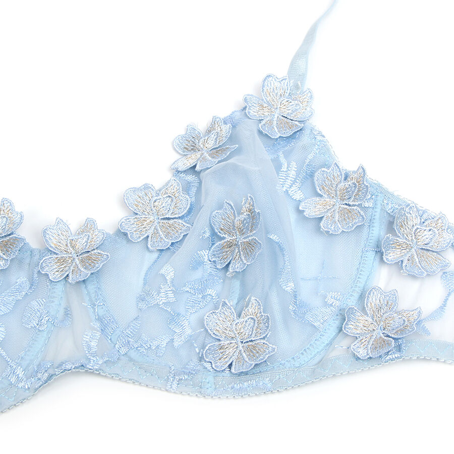 Dieses exquisite Set in Blautönen besticht durch sein durchscheinendes Netz mit Blumenstickerei, ein Design, das die Zartheit von Spitze mit der Leichtigkeit von Stoff für ein ätherisches und verführerisches Finish kombiniert. Der Spitzen-BH mit halbtransparenten Cups und gestickten Details umrahmt die Brust elegant und bietet subtilen Halt, ohne an Sinnlichkeit einzubüßen. Verstellbare Träger und ein Rückenverschluss sorgen für eine perfekte und bequeme Passform.